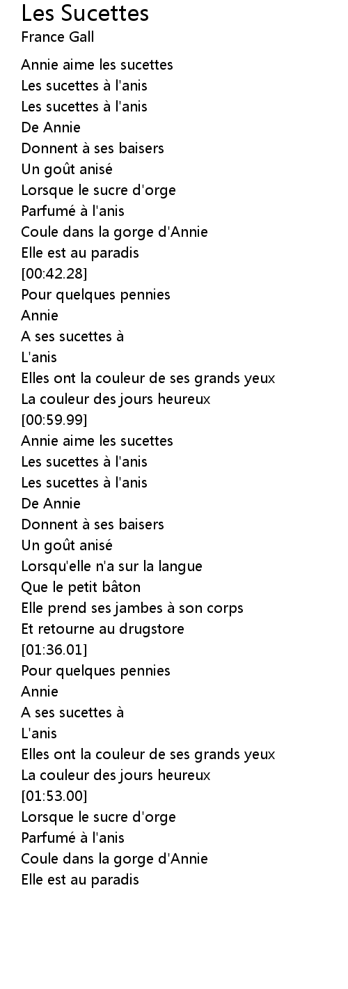 | [00:34.20] | Coule dans la gorge d' Annie |
