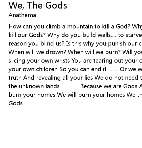 How can you climb a mountain to kill a God? Why do you cross unknown lands, to kill our Gods? Why do you build walls.... to starve our Gods? Is it for the same reason you blind us? Is this why you punish our children? And rape our sisters? When will we drown? When will we burn? Will you die with us? I think so You are slicing your own wrists You are tearing out your own hearts And you are drowning your own children So you can end it ....... Or we will We are telling them the truth And revealing all your lies We do not need to climb a mountain Or to cross the unknown lands..... ....... Because we are Gods And we will drown you We will burn your homes We will burn your homes We the people, we the spirits, we the Gods. |