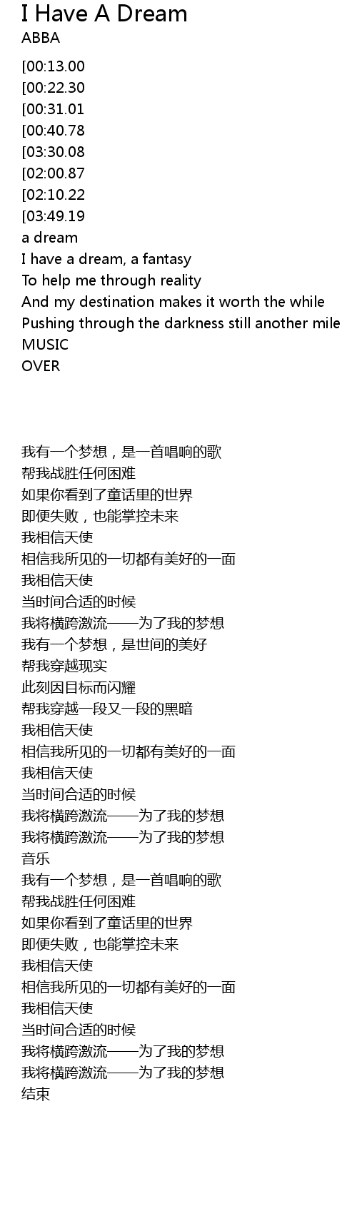 | [03:58.29][03:49.19][02:23.37][02:14.29][01:08.28] | I'll cross the stream - I have a dream |