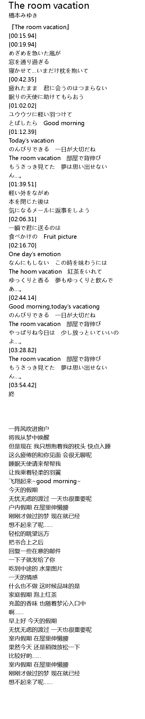 | [03:11.38] | The room vacation 部屋で背伸び |