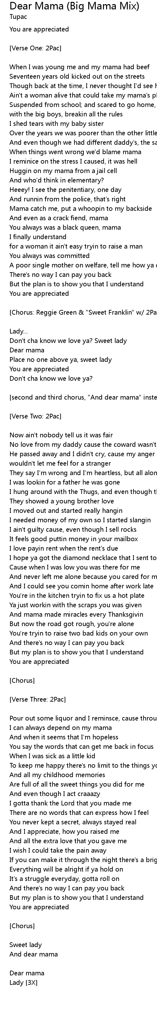 [second and third chorus, "And dear mama" instead of "Dear mama"] |