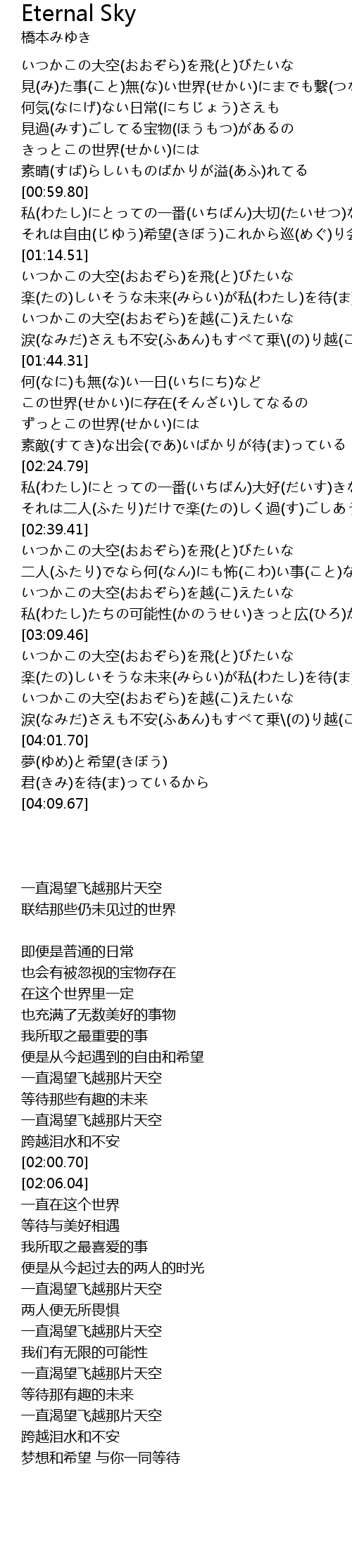 | [03:45.47] | いつかこの大空(おおぞら)を越(こ)えたいな |