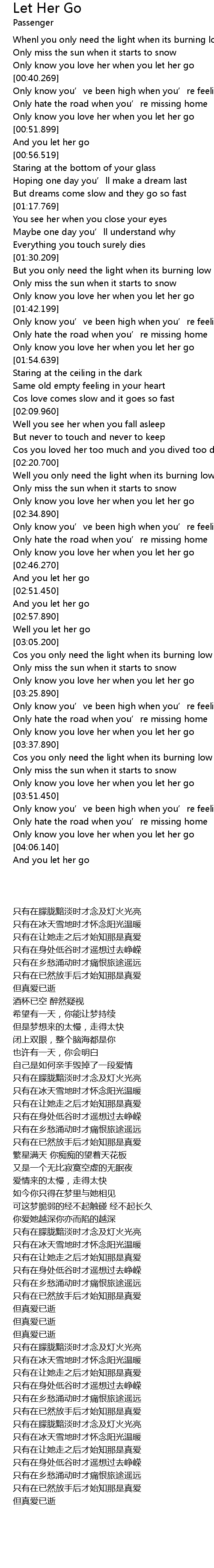 | [00:36.389] | Only know you love her when you let her go |