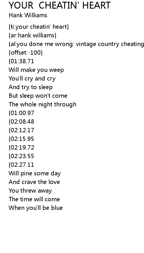 | [00:08.88][01:38.71] | Your cheatin' heart |