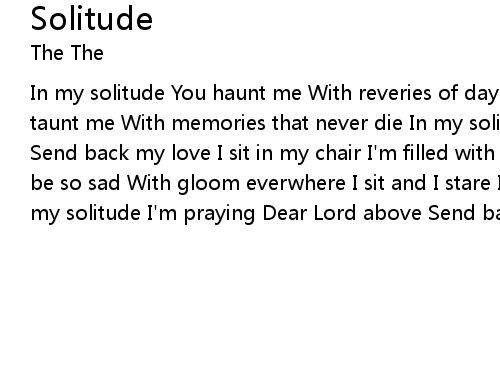 | In my solitude You haunt me With reveries of days gone by In my solitude You taunt me With memories that never die In my solitude I'm praying Dear Lord above Send back my love I sit in my chair I'm filled with despair 'Cause no one could be so sad With gloom everwhere I sit and I stare I know that I'll soon go mad In my solitude I'm praying Dear Lord above Send back my love |