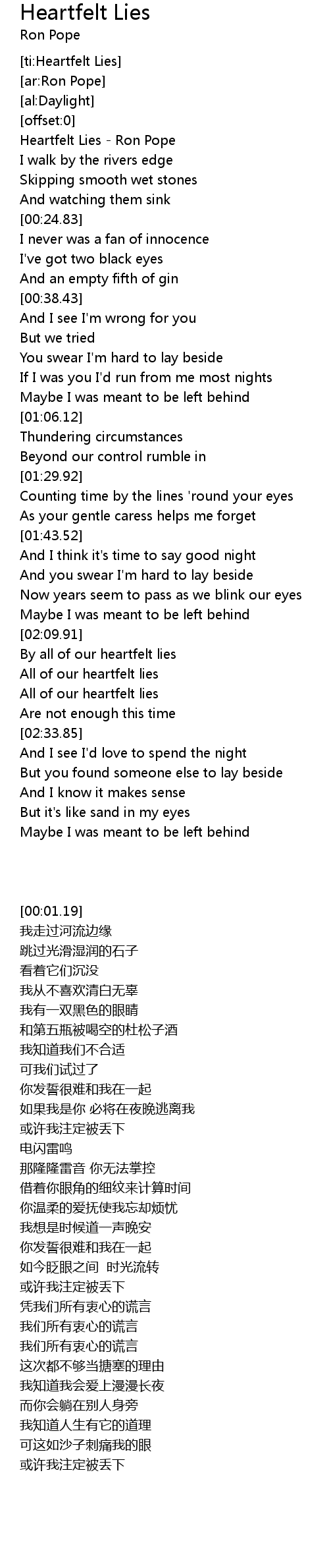 | [00:01.19] | Heartfelt Lies - Ron Pope |