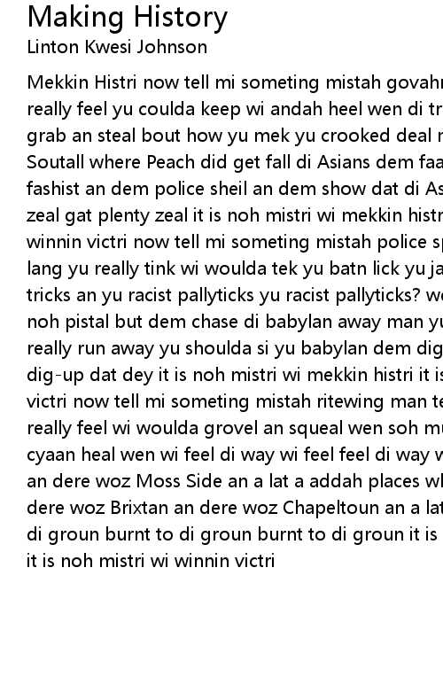 Mekkin Histri now tell mi someting mistah govahment tell mi someting how lang yu really feel yu coulda keep wi andah heel wen di trute done reveal bout how yu grab an steal bout how yu mek yu crooked deal mek yu crooked deal? well doun in Soutall where Peach did get fall di Asians dem faam-up a human wall gense di fashist an dem police sheil an dem show dat di Asians gat plenty zeal gat plenty zeal gat plenty zeal it is noh mistri wi mekkin histri it is noh mistri wi winnin victri now tell mi someting mistah police spokesman tell mi someting how lang yu really tink wi woulda tek yu batn lick yu jackboot kick yu dutty bag a tricks an yu racist pallyticks yu racist pallyticks? well doun in Bristal dey ad noh pistal but dem chase di babylan away man yu shoulda si yu babylan how dem really run away yu shoulda si yu babylan dem dig-up dat dey dig-up dat dey dig-up dat dey it is noh mistri wi mekkin histri it is noh mistri wi winnin victri now tell mi someting mistah ritewing man tell mi someting how lang yu really feel wi woulda grovel an squeal wen soh much murdah canceal wen wi woun cyaan heal wen wi feel di way wi feel feel di way wi feel? well dere woz Toxteh an dere woz Moss Side an a lat a addah places whey di police ad to hide well dere woz Brixtan an dere woz Chapeltoun an a lat a addah place dat woz burnt to di groun burnt to di groun burnt to di groun it is noh mistri wi mekkin histri it is noh mistri wi winnin victri |