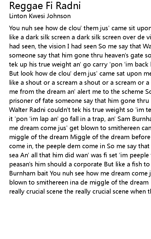 You nuh see how de clou' them jus' came sit upon me dream came sit upon me dream like a dark silk screen a dark silk screen over de vision I had seen vision I had seen, the vision I had seen So me say that Walter Radni was a victim of hate someone say that him gone thru heaven's gate someone that Walter Radni shouldn't tek up his true weight an' go carry 'pon 'im back like 'im de weary man a rock But look how de clou' dem jus' came sat upon me dream came sit upon me dream like a shout or a scream a shout or a scream or a really ugly scene that awake me from the dream an' alert me to the scheme So me say that Walter Radni was a prisoner of fate someone say that him gone thru de hero's gate someone say that Walter Radni couldn't tek his true weight so 'im tek it off 'im back an' go pick it 'pon 'im lap an' go fall in a trap, an' Sam Burnham get it drop But look how me dream come jus' get blown to smithereen came blown to smithereen ina de miggle of the dream Miggle of the dream before de peeple dem come in peeple dem come in, the peeple dem come in So me say that Walter Radni was no shark fi de sea An' all that him did wan' was fi set 'im peeple free Wi' de workers an' de peasan's him should a corporate But like a fish to de hook, 'im go bite 'pon Burnham bait You nuh see how me dream come jus' get blown to smithereen An' blown to smithereen ina de miggle of the dream Miggle of the dream before de really crucial scene the really crucial scene when the peeple dem come in |