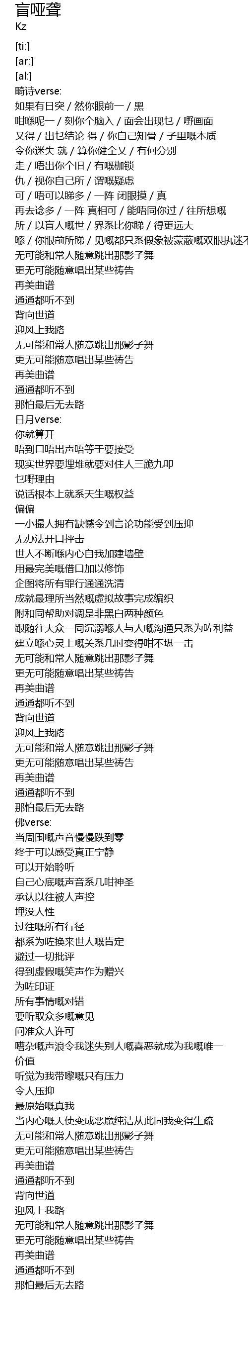 | [00:54.50] | 喺/你眼前所睇/见嘅都只系假象被蒙蔽嘅双眼执迷不悔将一切有问题嘅制度视为依归 |