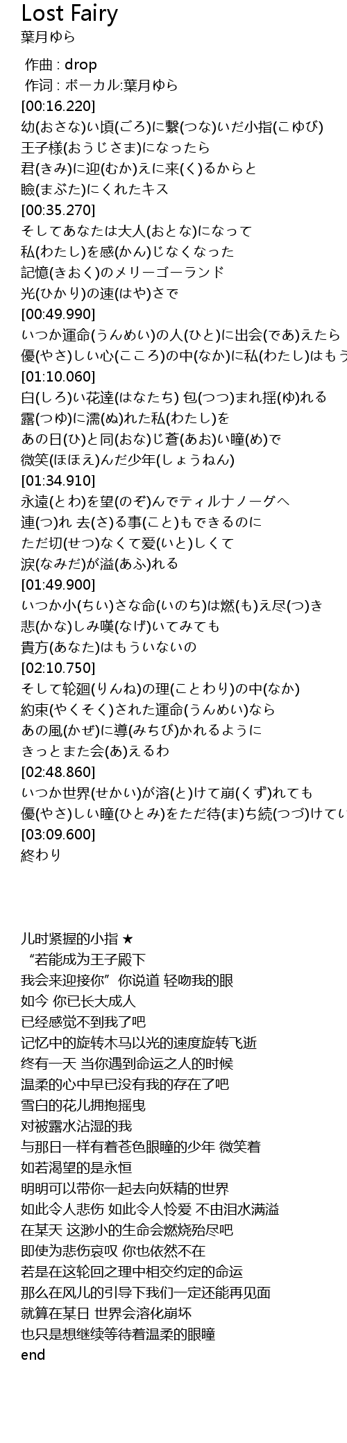 | [00:20.000] | 幼(おさな)い頃(ごろ)に繋(つな)いだ小指(こゆび) |