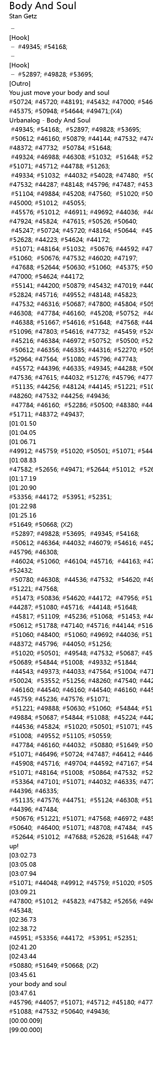 | [03:51.80][03:47.61][03:43.22][03:38.87][03:34.51][03:34.46][03:30.16][03:25.78] | #45796; #44057; #51071; #45712; #45180; #47743; #51068; #50612; #45247; #44543; #51088; #47532; #50640; #49436; |