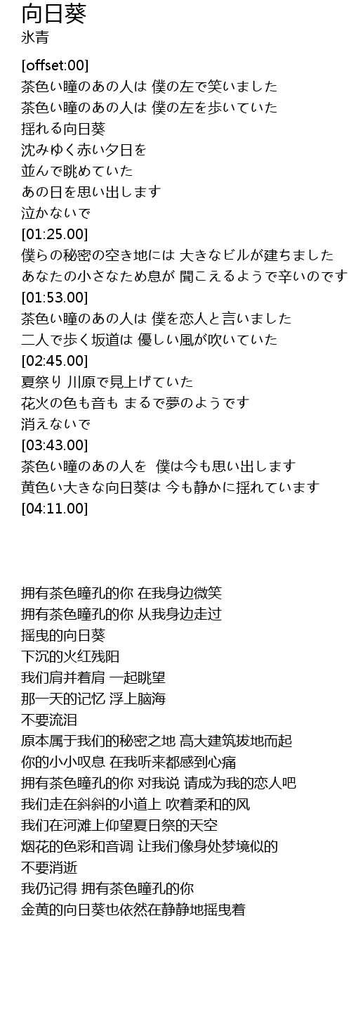| [03:57.00] | 黄色い大きな向日葵は 今も静かに揺れています |