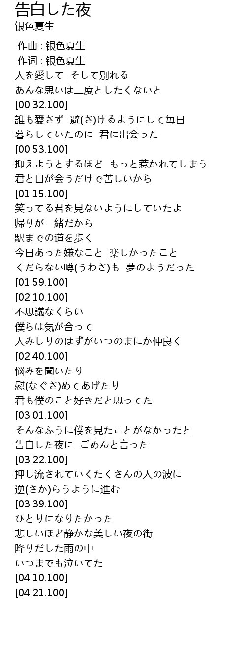 | [03:13.100] | 告白した夜に ごめんと言った |