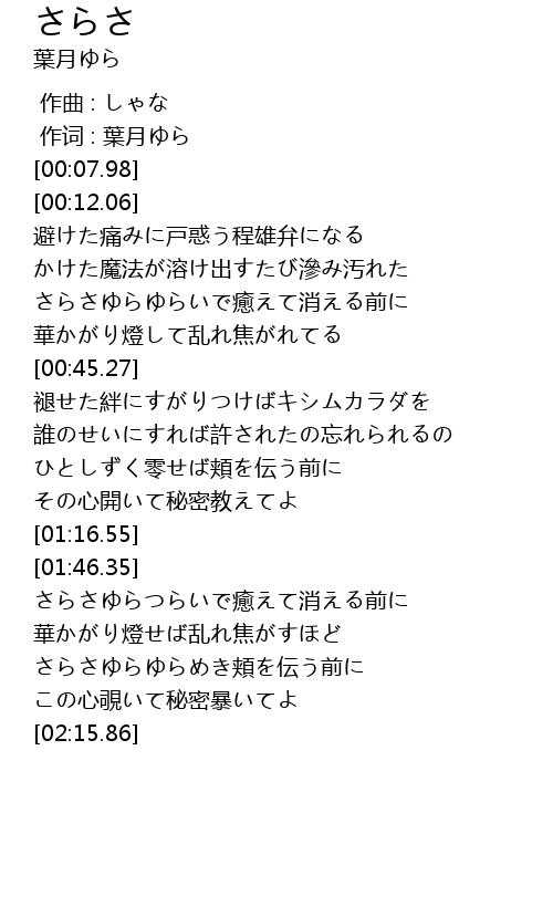 | [01:48.24] | さらさゆらつらいで癒えて消える前に |