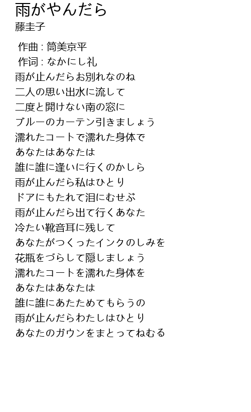 | [01:08.480] | 雨が止んだら私はひとり |