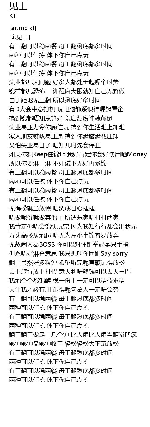 | [01:58.49] | 翻工虽然好多粒钟 希望听完呢首歌记得放松 |