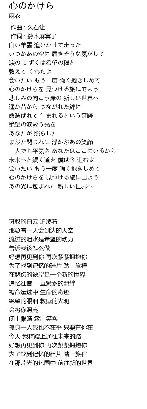 | [03:17.540] | 心のかけらを 見つける旅に出よう |
