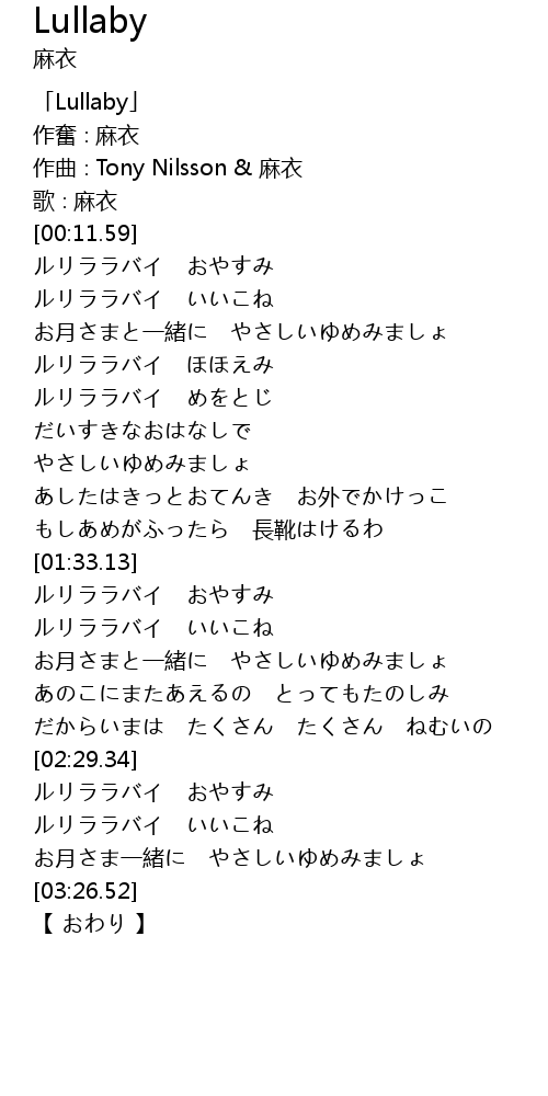 | [00:13.59] | ルリララバイ おやすみ |