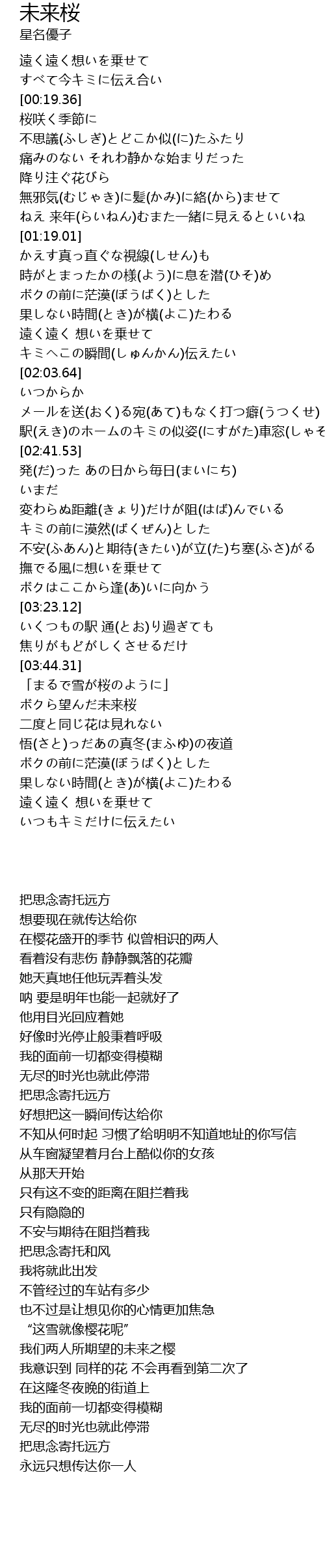 | [00:38.92] | 桜咲く季節に 不思議(ふしぎ)とどこか似(に)たふたり |