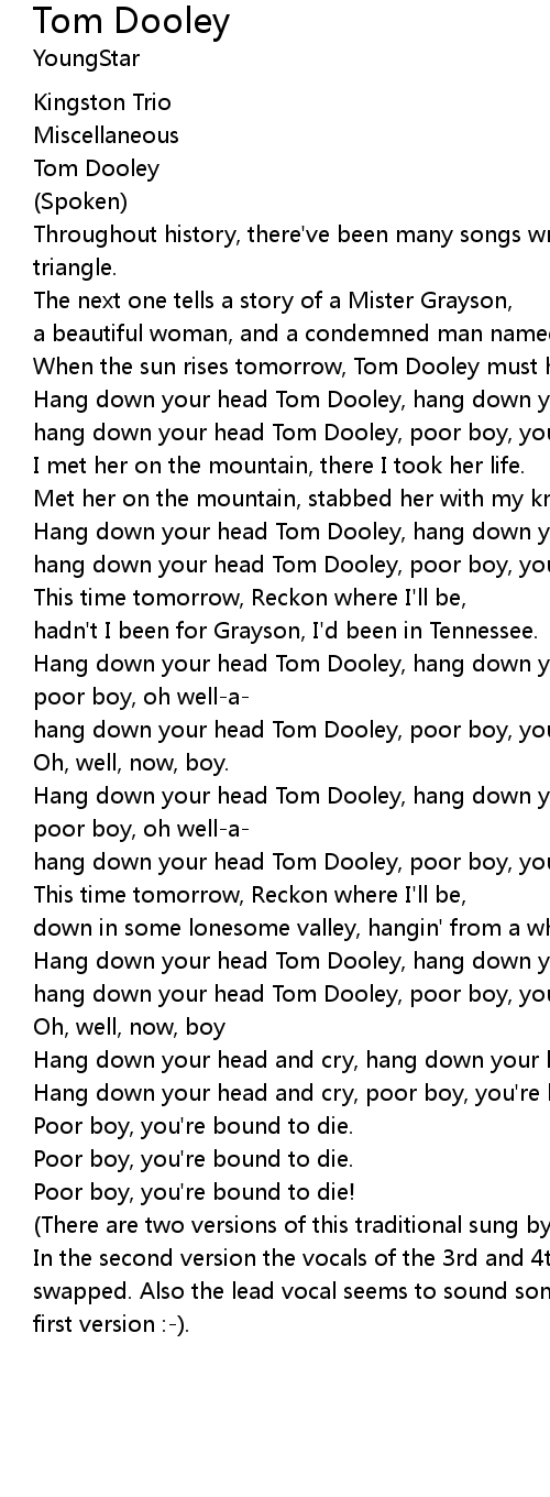 hang down your head Tom Dooley, poor boy, you're bound to die! |