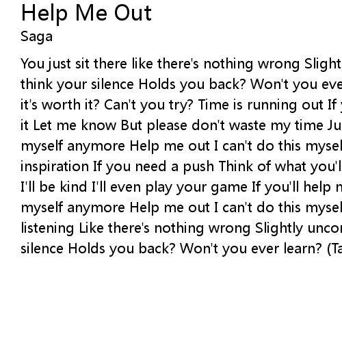 You just sit there like there's nothing wrong Slightly unconcerned Don't you think your silence Holds you back? Won't you ever learn? (Take it) Can't you see it's worth it? Can't you try? Time is running out If you don't think you'll make it Let me know But please don't waste my time Just help me out I can't do this myself anymore Help me out I can't do this myself anymore If you lack inspiration If you need a push Think of what you'll gain I won't criticize you I'll be kind I'll even play your game If you'll help me out I can't do this myself anymore Help me out I can't do this myself anymore You just sit there listening Like there's nothing wrong Slightly unconcerned Don't you think your silence Holds you back? Won't you ever learn? (Take it) |