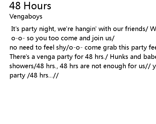 | [verse] It's party night, we're hangin' with our friends/ We're having a great time, we're breakin' all the fence/ [bridge] o-o- so you too come and join us/ no need to feel shy/o-o- come grab this party feelin', let's do it let's do it/ [chorus]There's a venga party for 48 hrs./ Hunks and babes dancin' under the showers/48 hrs., 48 hrs are not enough for us// yo party/ yo party /venga venga party /48 hrs...// |