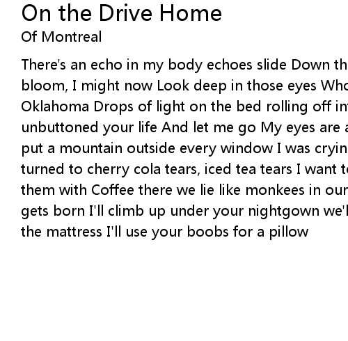 There's an echo in my body echoes slide Down the roof You looked like heaven in bloom, I might now Look deep in those eyes Whose kindness moves my Texas to Oklahoma Drops of light on the bed rolling off into a Puddle on the floor You unbuttoned your life And let me go My eyes are as brown as blueberries love Must put a mountain outside every window I was crying my eyes out everything I drank turned to cherry cola tears, iced tea tears I want to grab your words and fill them with Coffee there we lie like monkees in our beds Burying each frown that gets born I'll climb up under your nightgown we'll try to Tickle a laugh out of the mattress I'll use your boobs for a pillow |