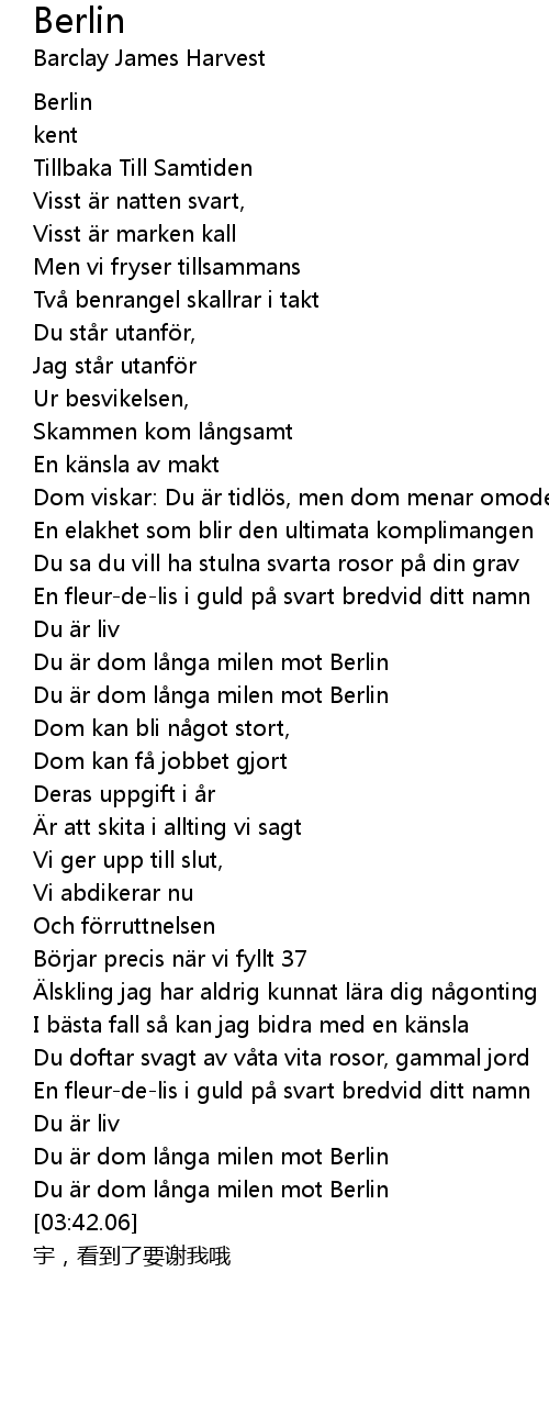 | [03:26.74] | Du är dom långa milen mot Berlin |