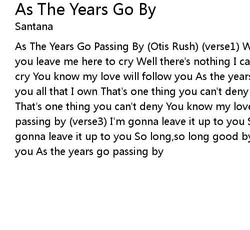 As The Years Go Passing By (Otis Rush) (verse1) Well there's nothing I can do If you leave me here to cry Well there's nothing I can do If you leave me here to cry You know my love will follow you As the years go passing by (Verse2) I gave you all that I own That's one thing you can't deny I gave you all that I own That's one thing you can't deny You know my love will follow you As the years go passing by (verse3) I'm gonna leave it up to you So long,so long good bye I'm gonna leave it up to you So long,so long good bye You know my love will follow you As the years go passing by |