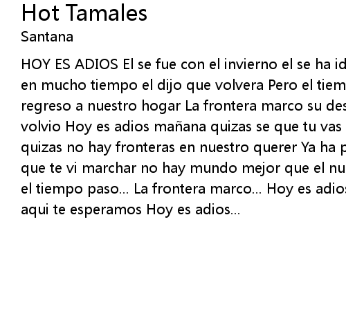 | HOY ES ADIOS El se fue con el invierno el se ha ido a trabajar no me ha escrito en mucho tiempo el dijo que volvera Pero el tiempo paso no preguntes pq el ya no regreso a nuestro hogar La frontera marco su destino final y a mis brazos jamas volvio Hoy es adios ma ana quizas se que tu vas a volver Hoy es adios ma ana quizas no hay fronteras en nuestro querer Ya ha pasado un nuevo invierno desde que te vi marchar no hay mundo mejor que el nuestro se que un dia volveras Pero el tiempo paso... La frontera marco... Hoy es adios... Hablado: Vuelve hijo mio aqui te esperamos Hoy es adios... |