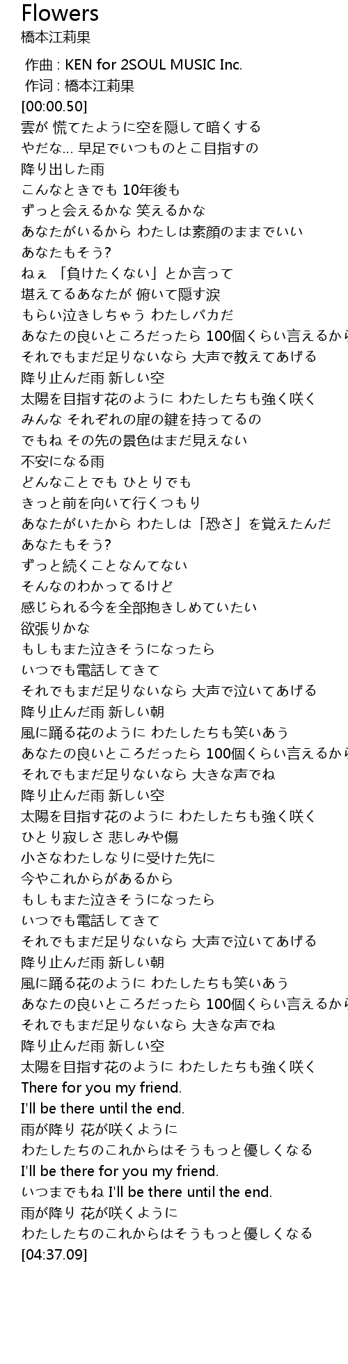 | [04:18.29] | I' ll be there for you my friend. |