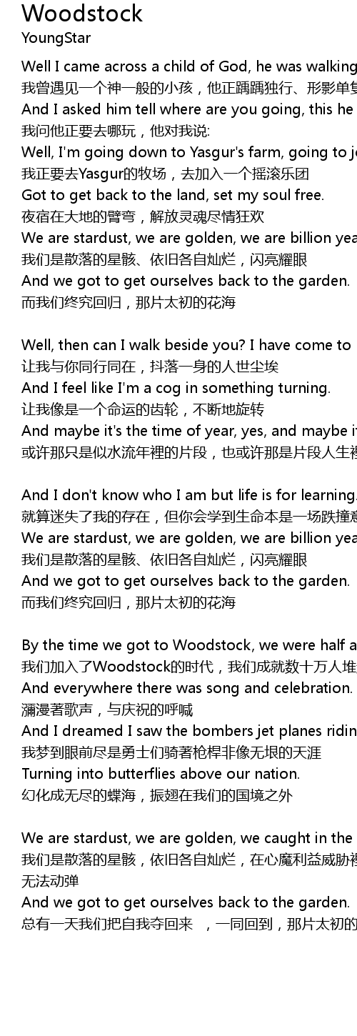 | wǒ men jiā rù le Woodstock de shí dài, wǒ men chéng jiù shù shí wàn rén duī qǐ de chéng yuán | |