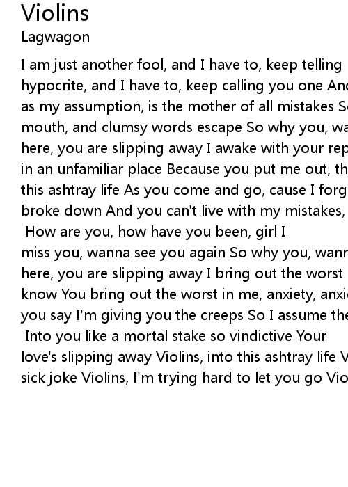 I am just another fool, and I have to, keep telling myself that I am just a hypocrite, and I have to, keep calling you one And I forgot to bite my tongue, as my assumption, is the mother of all mistakes So I assume the role, open my mouth, and clumsy words escape So why you, wanna be there, when you could be here, you are slipping away I awake with your replacement, a bottle in my grasp, in an unfamiliar place Because you put me out, the butt of a sick joke, into this ashtray life As you come and go, cause I forgot to service you, and we broke down And you can't live with my mistakes, but I assume false grace Open my arms and grasp at something true [chorus] How are you, how have you been, girl I miss you, wanna see you again So why you, wanna be there, when you could be here, you are slipping away I bring out the worst in you, and you try to let me know You bring out the worst in me, anxiety, anxiety I'm trying to let you go, you say I'm giving you the creeps So I assume the role, open my claws and grasp for your heart [repeat chorus] Into you like a mortal stake so vindictive Your love's slipping away Violins, into this ashtray life Violins, the butt of your sick joke Violins, I'm trying hard to let you go Violins |