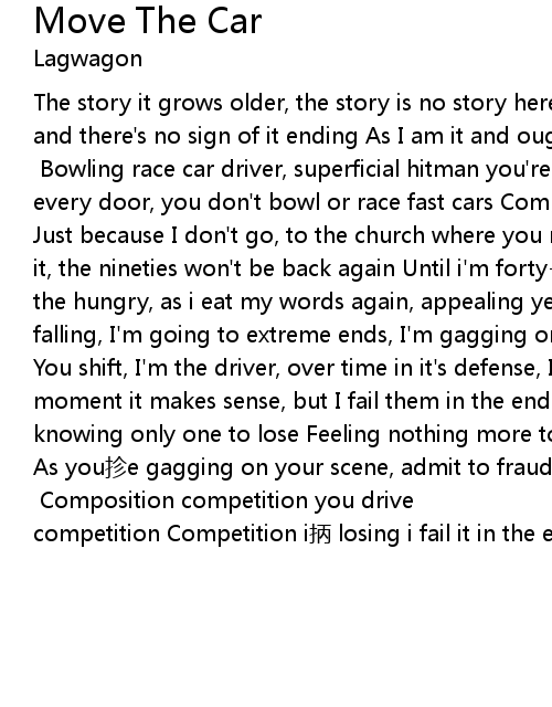 | The story it grows older, the story is no story here I never knew what it is, and there' s no sign of it ending As I am it and ought to be, they' re telling me I am chorus Bowling race car driver, superficial hitman you' re On the list at every door, you don' t bowl or race fast cars Composition competition you drive Just because I don' t go, to the church where you reside I might as well go for it, the nineties won' t be back again Until i' m fortyeight years old I can be the hungry, as i eat my words again, appealing yet apalling rising to my falling, I' m going to extreme ends, I' m gagging on their scene repeat chorus You shift, I' m the driver, over time in it' s defense, I move their car And for a moment it makes sense, but I fail them in the end In the arms of old age, knowing only one to lose Feeling nothing more to hide, consider life a forgery As you zhěn e gagging on your scene, admit to fraudulence Driven to this thought, death is certain, faith is not repeat chorus Composition competition you drive competition Competition i bǐng losing i fail it in the end |