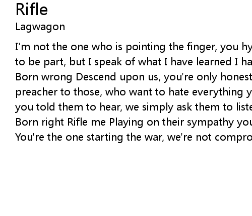 I'm not the one who is pointing the finger, you hypocrite We're not true enough to be part, but I speak of what I have learned I haven't a flag to be burned Born wrong Descend upon us, you're only honest, but are you an artist Or just a preacher to those, who want to hate everything you told them to see Everything you told them to hear, we simply ask them to listen and express what we feel Born right Rifle me Playing on their sympathy you're the one waving the flag You're the one starting the war, we're not compromising or trying to conquer |