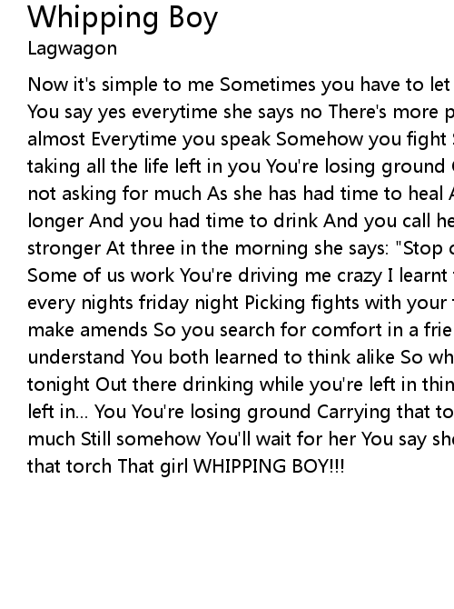 Now it's simple to me Sometimes you have to let go when there's Next to nothing You say yes everytime she says no There's more pain then love It comes to shove almost Everytime you speak Somehow you fight Something's just crazy Somehow it's taking all the life left in you You're losing ground Carrying that torch Your not asking for much As she has had time to heal And she doesn't need you any longer And you had time to drink And you call her to tell her you've gotten much stronger At three in the morning she says: "Stop calling cause everyone's asleep Some of us work You're driving me crazy I learnt to get on with my life..." Now every nights friday night Picking fights with your friends Somehow trying to make amends So you search for comfort in a friend It's not the same she won't understand You both learned to think alike So what was so wrong Where's she tonight Out there drinking while you're left in thinking It's taken all the life left in... You You're losing ground Carrying that torch You're not asking for much Still somehow You'll wait for her You say she'll return But you still carry that torch That girl WHIPPING BOY!!! |