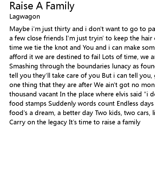 Maybe i'm just thirty and i don't want to go to parties anymore Only really need a few close friends I'm just tryin' to keep the hair on my head I think it's time we tie the knot and You and i can make some babies Marriage, mortgage Can't afford it we are destined to fail Lots of time, we are late what the hell? Smashing through the boundaries lunacy as found me gotta have a family Boys will tell you they'll take care of you But i can tell you, girl that there is only one thing that they are after We ain't got no money, honey it's true Ten thousand vacant In the place where elvis said "i do" "Love me tender" Four kids, food stamps Suddenly words count Endless days of minimum wage Love is ours, food's a dream, a better day Two kids, two cars, life insurance, credit cards Carry on the legacy It's time to raise a family |