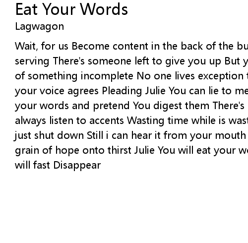 Wait, for us Become content in the back of the bus Guilty of the time you spent serving There's someone left to give you up But you're not Laboring the thought of something incomplete No one lives exception to this passing grief Unstable in your voice agrees Pleading Julie You can lie to me honestly Julie I will eat your words and pretend You digest them There's always someone here for more I always listen to accents Wasting time while is wasting you and I never left i just shut down Still i can hear it from your mouth Counting...seconds With a grain of hope onto thirst Julie You will eat your words and you'll purge And you will fast Disappear |
