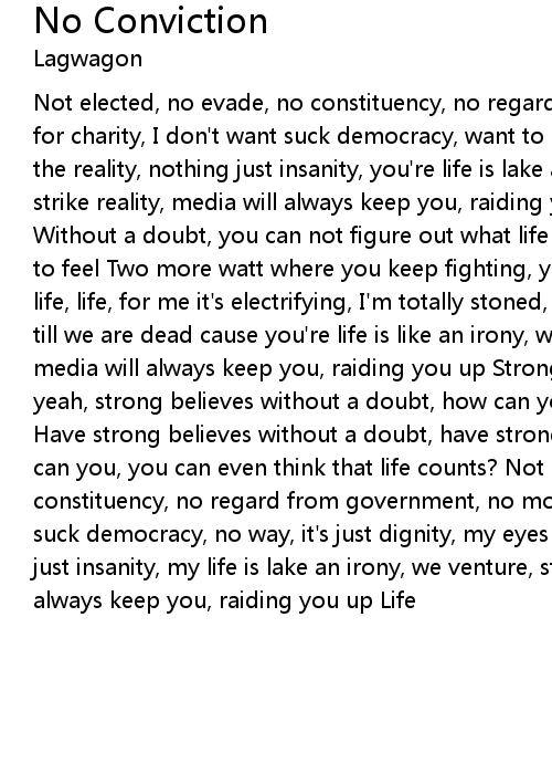 Not elected, no evade, no constituency, no regard from government, no more sense for charity, I don't want suck democracy, want to keep my dignity, my eyes see the reality, nothing just insanity, you're life is lake an irony, we venture, strike reality, media will always keep you, raiding you up Strong believes Without a doubt, you can not figure out what life is all about and are trapped to feel Two more watt where you keep fighting, you're empty inside, life, life, life, life, for me it's electrifying, I'm totally stoned, singing and ringing up till we are dead cause you're life is like an irony, we venture, strike reality, media will always keep you, raiding you up Strong believes Without a doubt, yeah, strong believes without a doubt, how can you, how can you, how can you Have strong believes without a doubt, have strong believes without a doubt, how can you, you can even think that life counts? Not elected, no evade, no constituency, no regard from government, no more sense for charity, I don't want suck democracy, no way, it's just dignity, my eyes see the real world, nothing just insanity, my life is lake an irony, we venture, strike reality, media will always keep you, raiding you up Life |