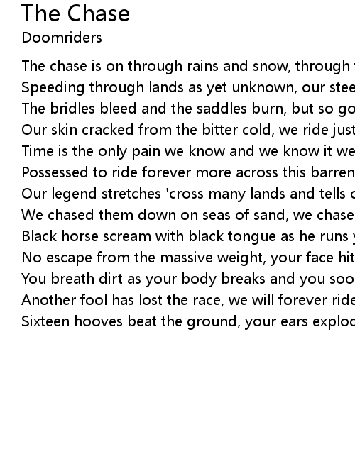 The chase is on through rains and snow, through forest dense and black |