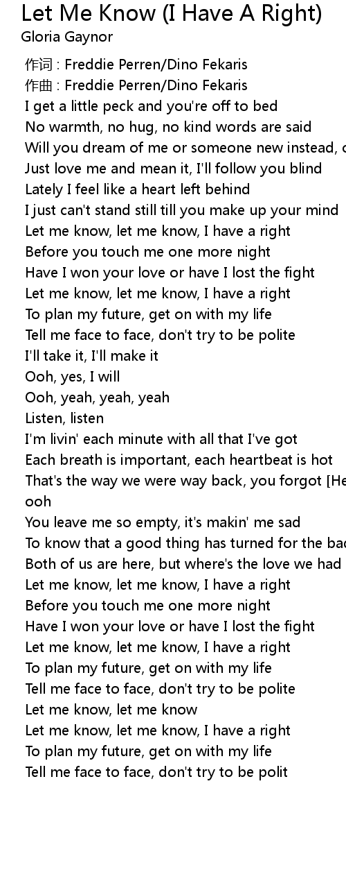 | [00:59.001] | Let me know, let me know, I have a right |