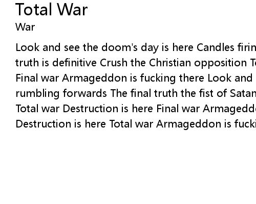 | Look and see the doom's day is here Candles firing, shells exploded The final truth is definitive Crush the Christian opposition Total war Destruction is here Final war Armageddon is fucking there Look and see darkness is here A tanks are rumbling forwards The final truth the fist of Satan Perish the flames of hell Total war Destruction is here Final war Armageddon is fucking there Total war Destruction is here Total war Armageddon is fucking there |