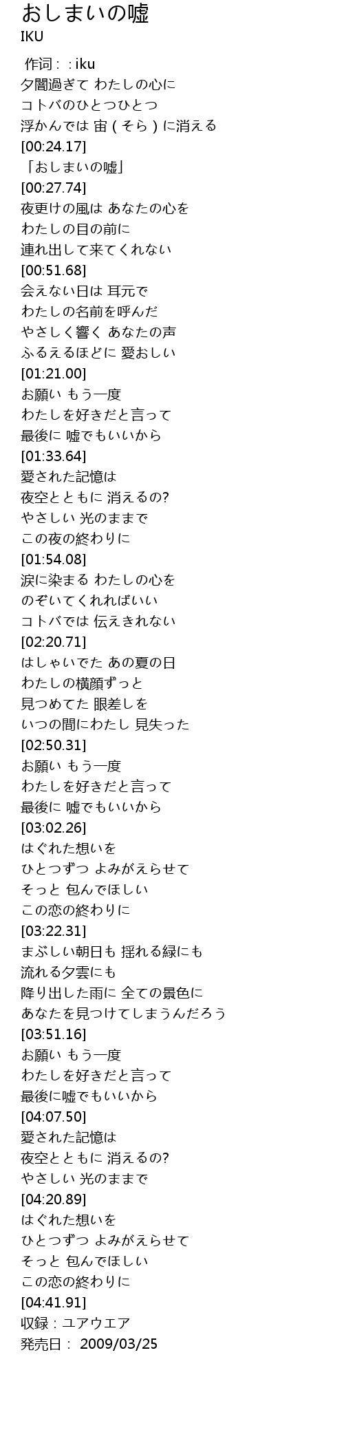 | [00:20.22] | 浮かんでは 宙(そら)に消える |