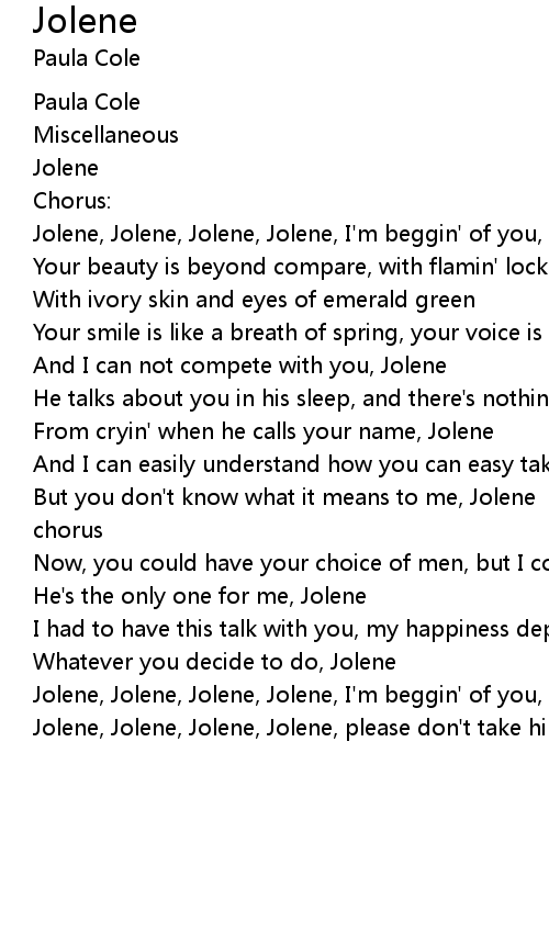 Jolene, Jolene, Jolene, Jolene, I'm beggin' of you, please don't take my man |