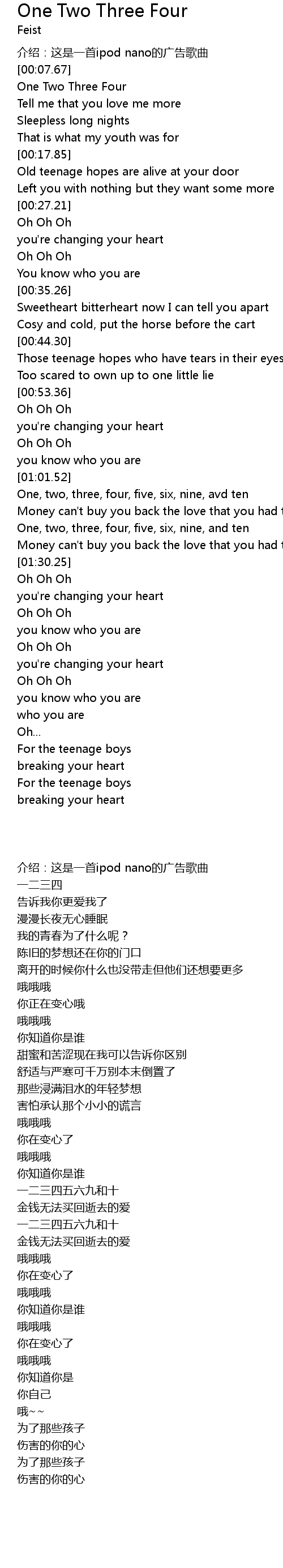 | [01:19.54] | One, two, three, four, five, six, nine, and ten |