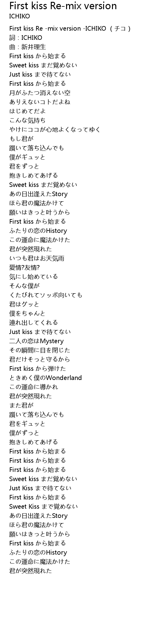 | [00:00.00] | First kiss Re -mix version -ICHIKO (チコ) |