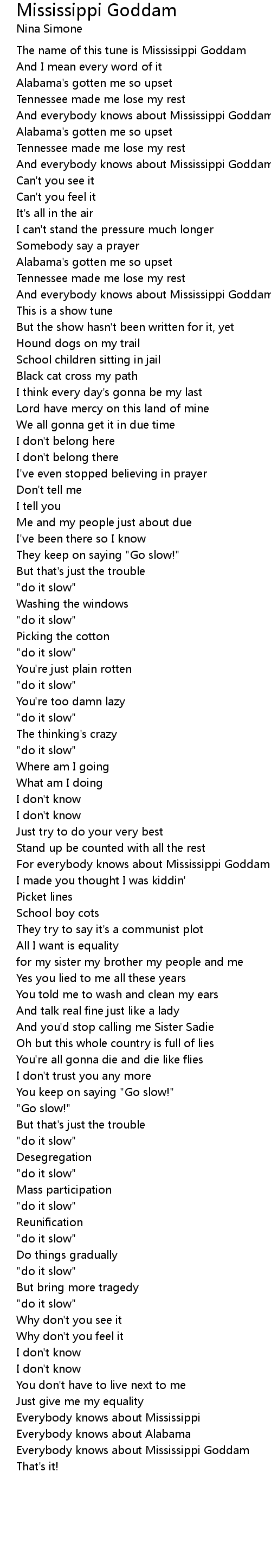 For everybody knows about Mississippi Goddam |