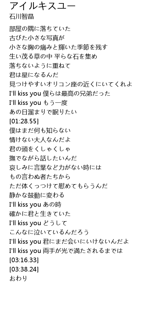 | [02:48.94] | I'll kiss you 君にまだ会いにいけないんだよ |