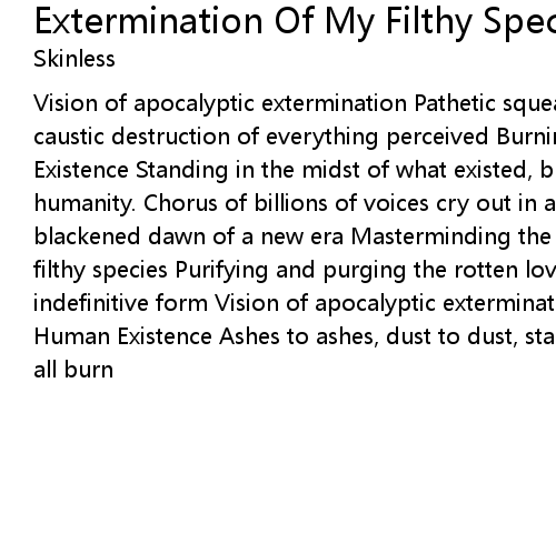 Vision of apocalyptic extermination Pathetic squealing human beings Forcing the caustic destruction of everything perceived Burning Cleansing Ending Human Existence Standing in the midst of what existed, blowing away the ashes of humanity. Chorus of billions of voices cry out in agony Last one standing in the blackened dawn of a new era Masterminding the omnipotent extermination of my own filthy species Purifying and purging the rotten loveless ore Resurrected in indefinitive form Vision of apocalyptic extermination Burning Cleansing Ending Human Existence Ashes to ashes, dust to dust, standing in the mist watching it all burn |