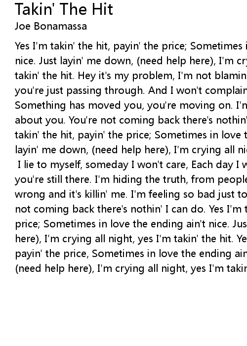 | Yes I'm takin' the hit, payin' the price; Sometimes in love the ending ain't nice. Just layin' me down, (need help here), I'm crying all night, yes I'm takin' the hit. Hey it's my problem, I'm not blaming you; And I wasn't love, you're just passing through. And I won't complain, your kiss wasn't calm, Something has moved you, you're moving on. I'm feelin' so bad just to think about you. You're not coming back there's nothin' I can do. ‘Cuz I'm takin' the hit, payin' the price; Sometimes in love the ending ain't nice. Just layin' me down, (need help here), I'm crying all night, yes I'm takin' the hit. [Lead Break] I lie to myself, someday I won't care, Each day I wake up and you're still there. I'm hiding the truth, from people I see, Know something's wrong and it's killin' me. I'm feeling so bad just to think about you, You're not coming back there's nothin' I can do. Yes I'm takin' the hit, payin' the price; Sometimes in love the ending ain't nice. Just layin' me down, (need help here), I'm crying all night, yes I'm takin' the hit. Yes I'm takin' the hit, payin' the price, Sometimes in love the ending ain't nice. Just layin' me down, (need help here), I'm crying all night, yes I'm takin' the hit |